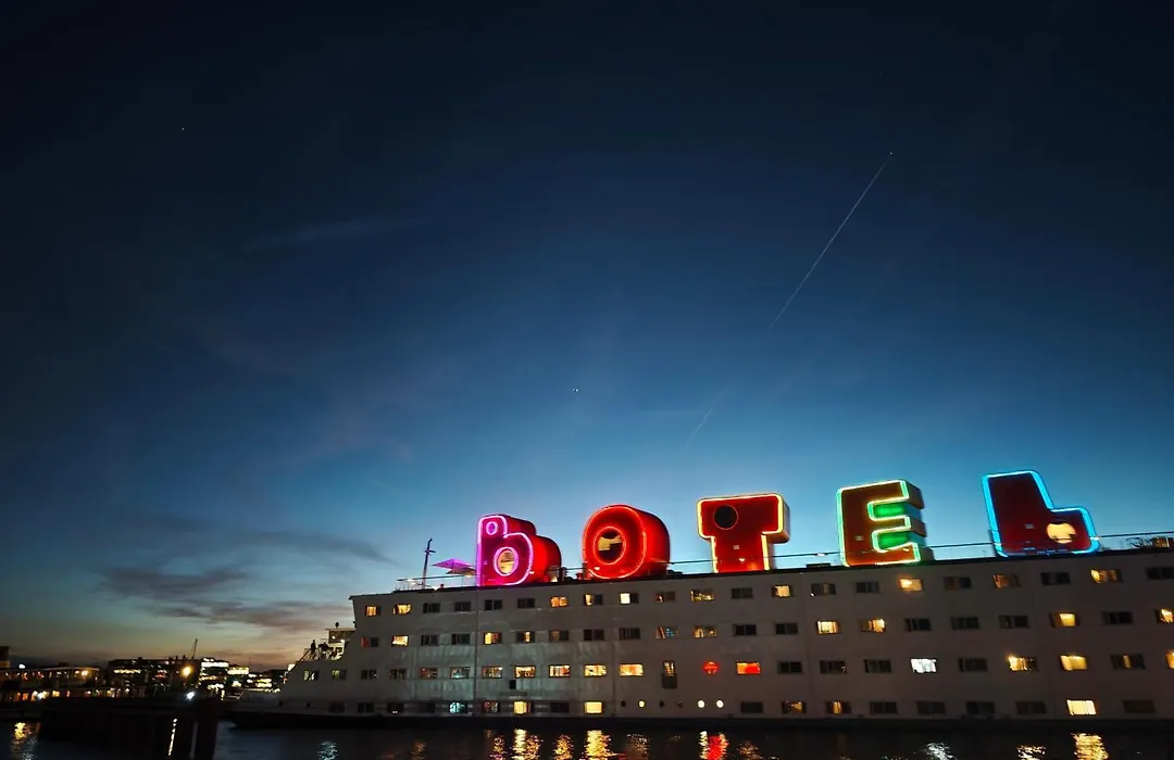 Botel is a unique 3-star hotel situated on the water, providing rooms with views of the NDSM harbour or the IJ canal. Amenities include free WiFi, a buffet breakfast, and a cozy communal bar with a pool table. It serves as a base for exploring the city's attractions and art scene.