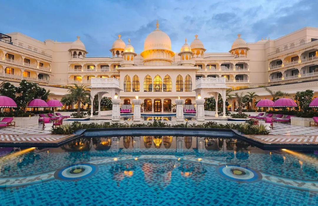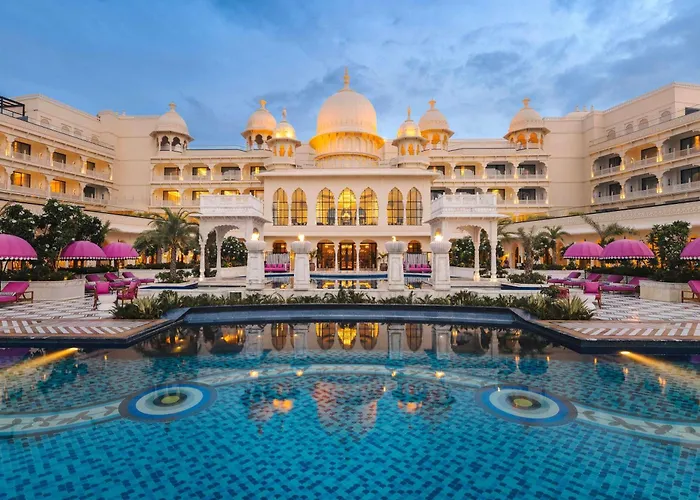 Fairmont Udaipur Palace, a 5-star hotel rated 9.9/10 on Booking.com, features spacious accommodations including quadruple and suite options with private balconies and hot tubs. On-site amenities include dining options and a pool complex, providing an elevated experience for guests.