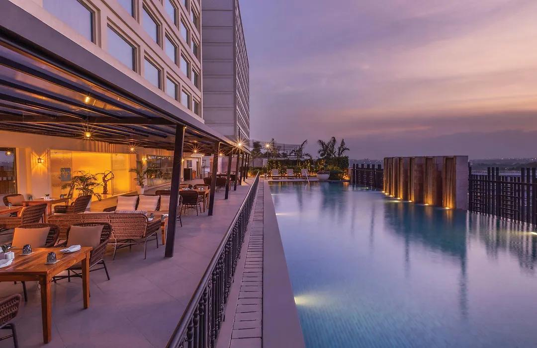 Leisure amenities include an outdoor infinity pool and a 24-hour fitness center equipped with Life Fitness machines. Nearby attractions include Akshardham Temple and KidZania Delhi NCR, offering cultural and entertainment options within a 20-minute drive.