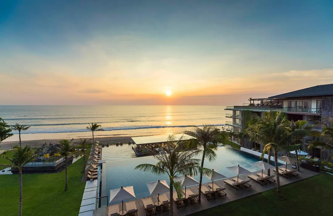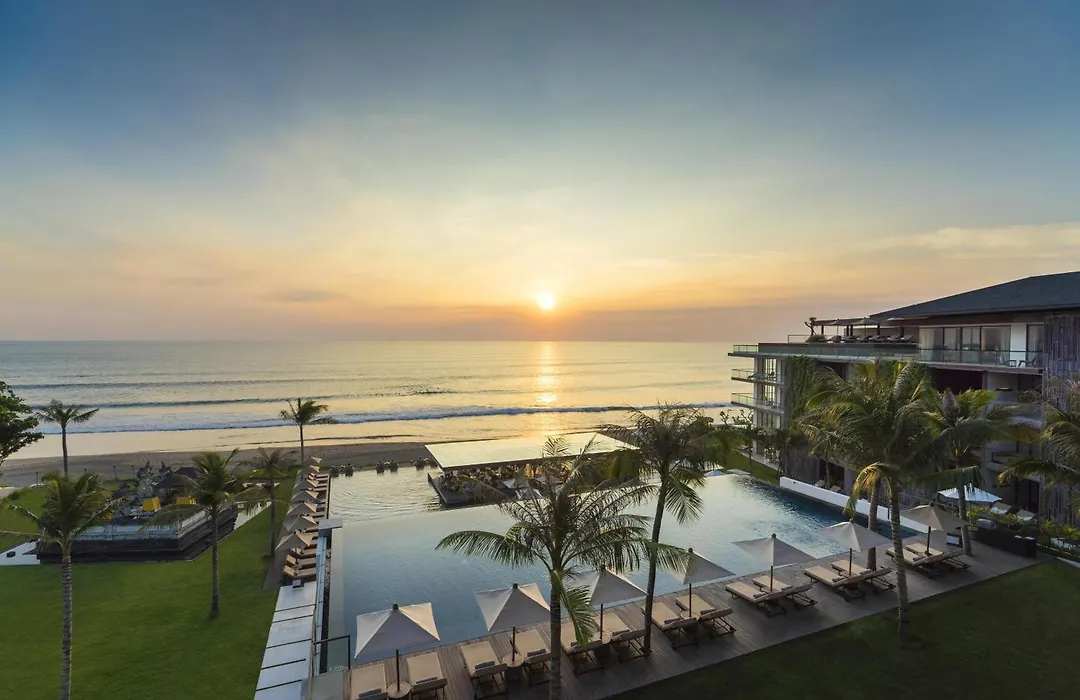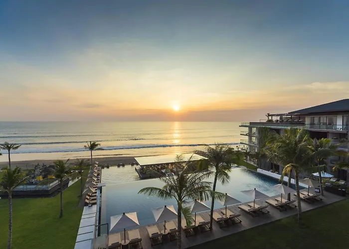 Alila Seminyak, a 5-star beachfront resort, features contemporary design with five swimming pools, including one for adults only. Guests can indulge in spa treatments, quality dining, and vibrant bar experiences within spacious surroundings.
