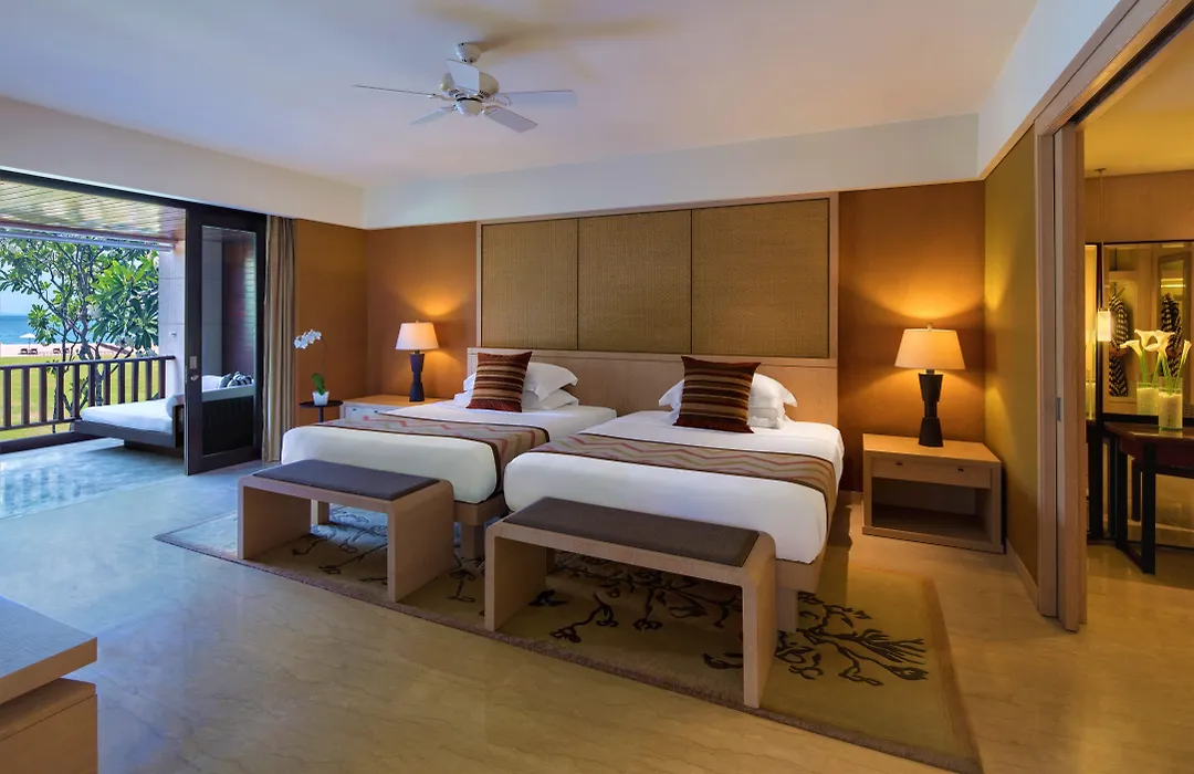 Accommodations at Conrad Bali include spacious rooms, suites, and villas reflecting Bali's unique culture. Options feature private balconies with ocean, pool, or garden views. Select suites include a separate living room, dining area, and luxurious bathrooms with dual vanities.