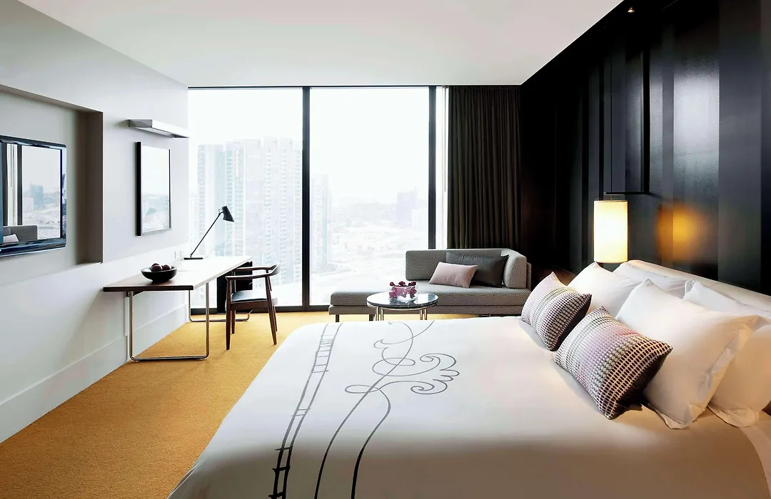 Guest accommodations at Crown Metropol Melbourne include floor-to-ceiling windows with city views and designer furniture. The hotel offers Luxe King and Urban Luxe rooms that feature custom-made king beds and fast Wi-Fi.