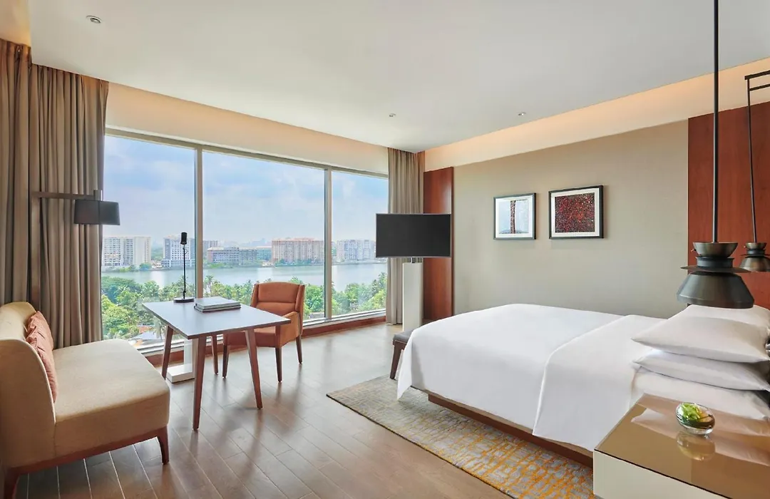 All 264 rooms at Grand Hyatt Kochi Bolgatty include premium bedding and air conditioning. Guests can enjoy spectacular views of the lake, gardens, city, or pool from their accommodations. Suites offer additional amenities such as private balconies and more spacious living areas.