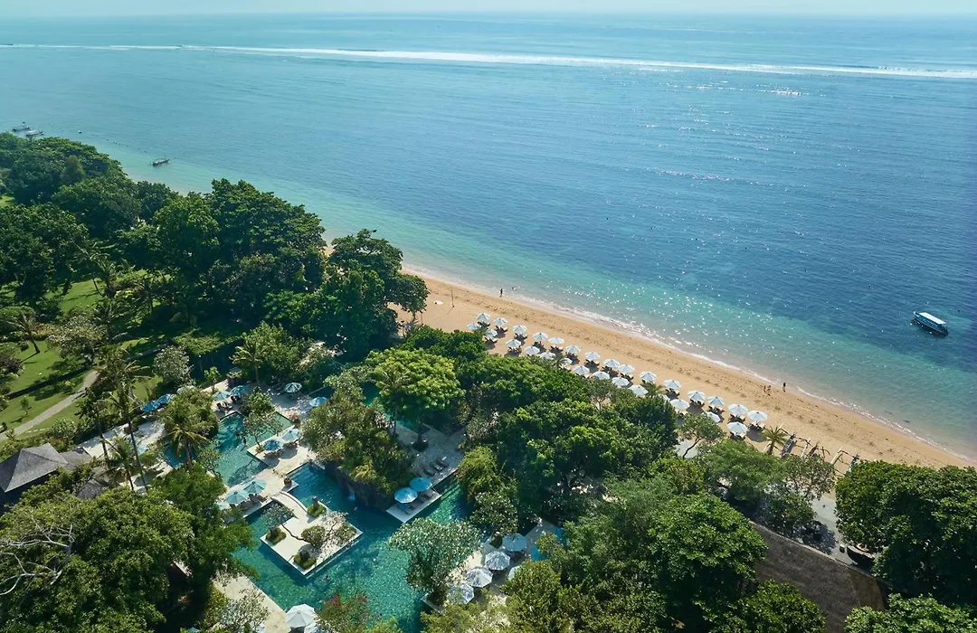 Hyatt Regency Bali, a 5-star hotel rated 9.0/10 on Booking.com, features a beachfront location and extensive wellness facilities. Guests can access three outdoor pools, a spa, and a 24-hour gym.
