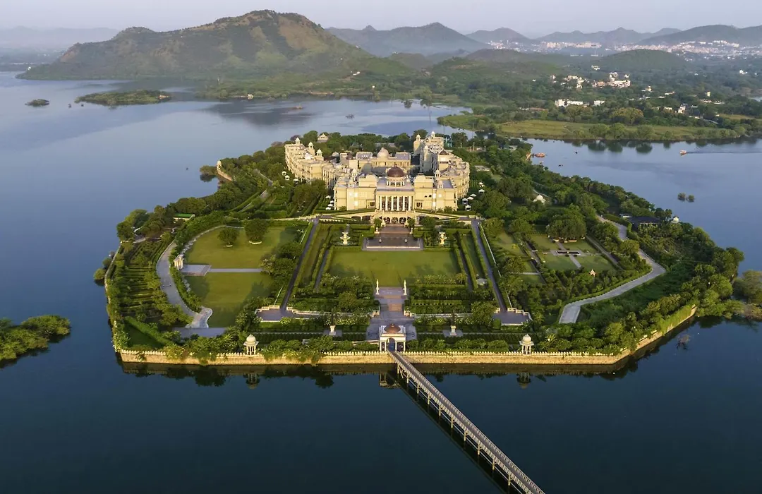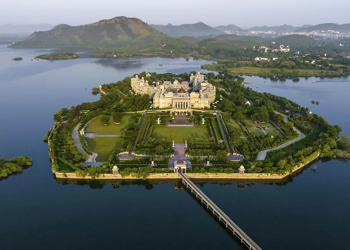 Raffles Udaipur is a 5-star hotel offering 137 rooms and suites set on a private island near Udai Sagar Lake. The hotel emphasizes personalized service through the Raffles Butler and features extensive dining options and leisure activities. There's a distinct blend of Indo-Saracenic architecture and European influences throughout the property.