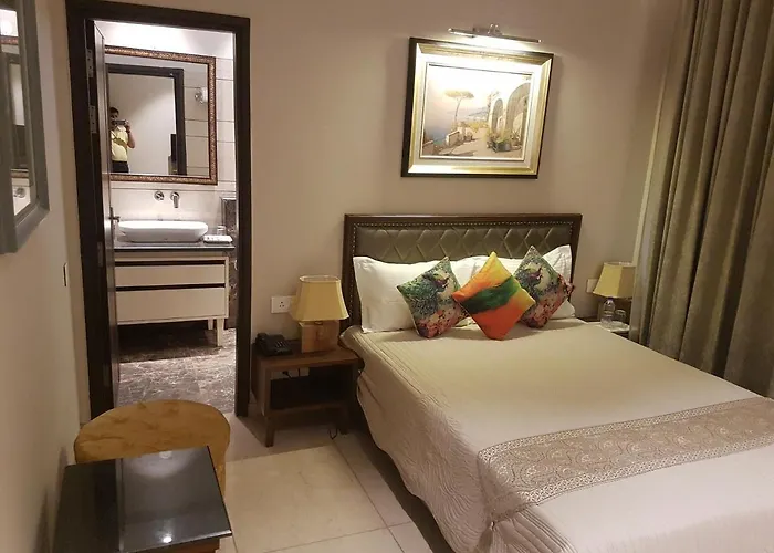 The hotel offers 16 rooms and suites, including Deluxe Rooms and a spacious Luxury Suite. All accommodations have modern amenities like hot and cold air-conditioning, LED TVs, fridges, and attached bathrooms with hot showers. Scenic views of the surrounding hills are visible from the rooms.