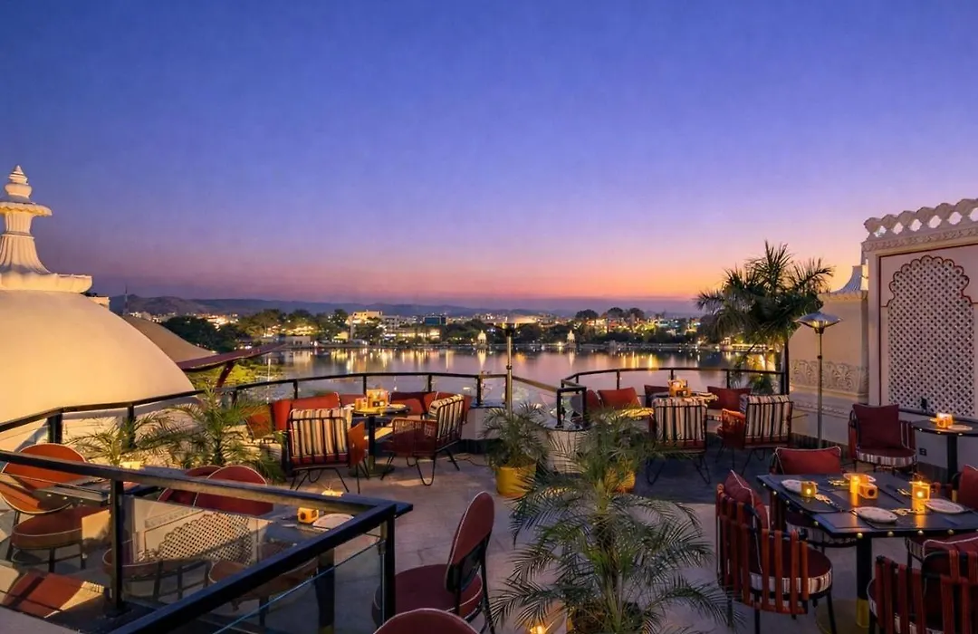 Dining options include The Vintage Room, offering a range of Rajasthani and Continental dishes, and The Pot Garden, a 24/7 bistro providing vegetarian and non-vegetarian meals. Sangria Bar & Rooftop Lounge serves multi-cuisine delights alongside views of the lake, and live music events enhance the dining experience.