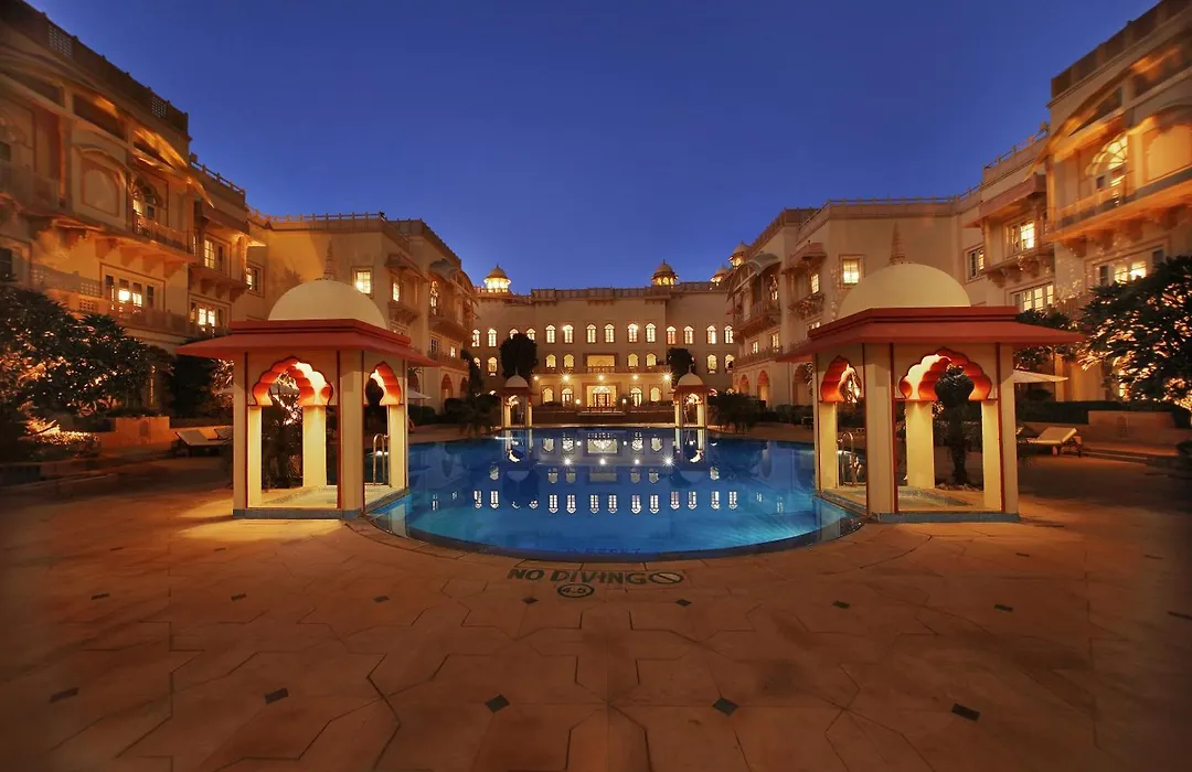 Taj Hari Mahal Jodhpur, a 5-star hotel with an 8.7/10 rating on Booking.com, is designed to resemble a 14th-century royal palace. It offers luxurious amenities including a spacious outdoor pool, a spa, and dining options featuring Rajasthani and Continental cuisines.