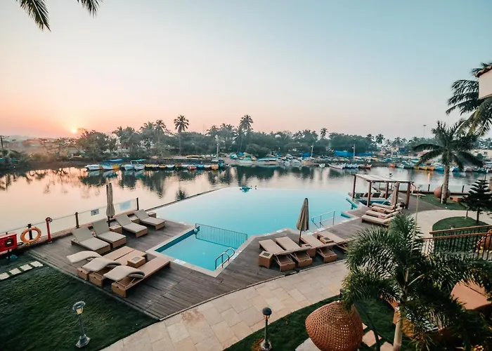 Acron Waterfront Resort, a 4-star Baga hotel rated 7.9/10 on Booking.com, features 29 plush rooms and 6 apartment suites in a rustic setting. Highlights include a tranquil infinity pool with ocean views and the acclaimed River Restaurant by UK MasterChef Cyrus Todiwala.