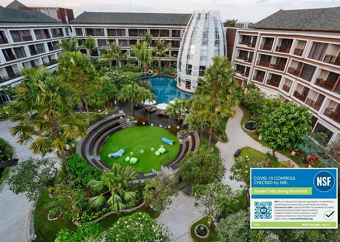 Golden Tulip Jineng Resort Bali is a 4-star hotel offering a blend of modern facilities and traditional Balinese design. It includes amenities such as a luxury Dedari Spa, an outdoor pool, and a fitness center. The hotel is situated in the busy commercial area at the new heart of Kuta.
