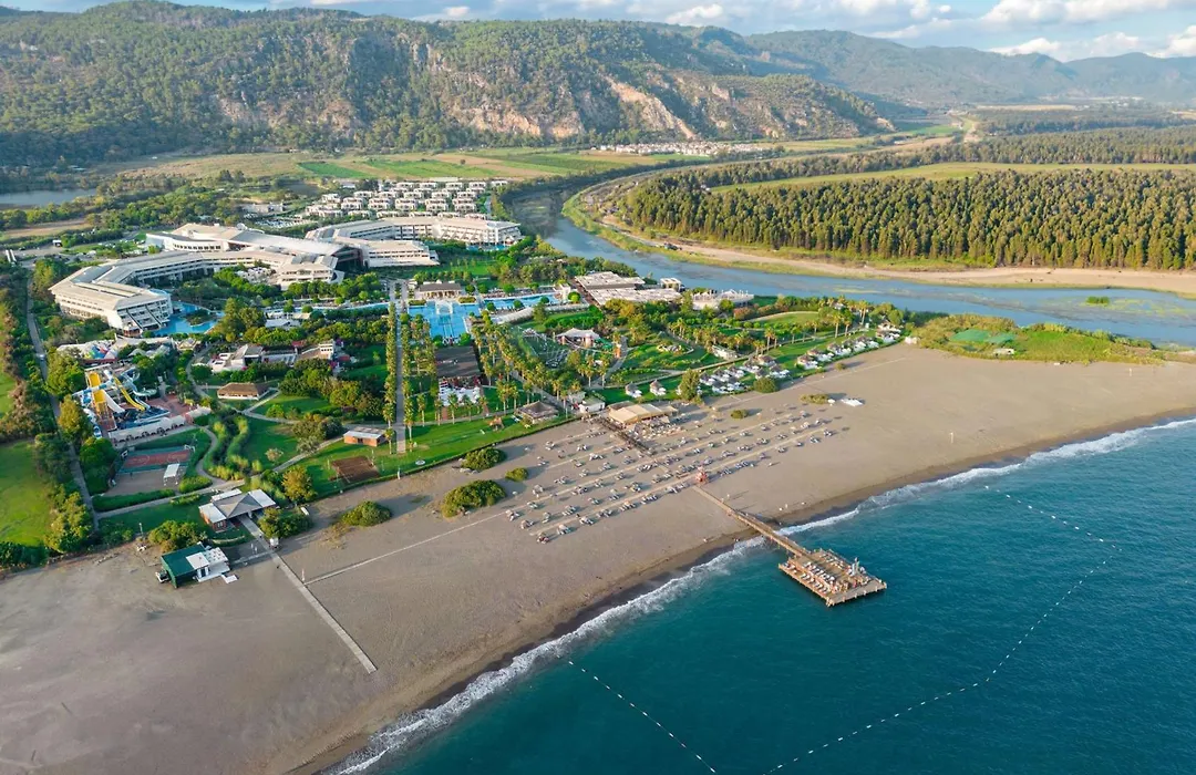 Hilton Dalaman Sarigerme Resort & Spa (5-star) offers an impressive range of amenities in a picturesque landscape featuring mountain ranges and crystal clear Aegean waters. This family-friendly resort includes access to a private beach, diverse dining options, and extensive recreational facilities.