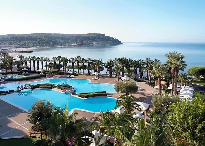 Sani Beach offers a five-star experience with its exclusive beaches, enticing spa, and a wide selection of on-site dining options. The hotel features amenities such as water sports, tennis coaching, and a large-scale pool area, promising activities for all family members.