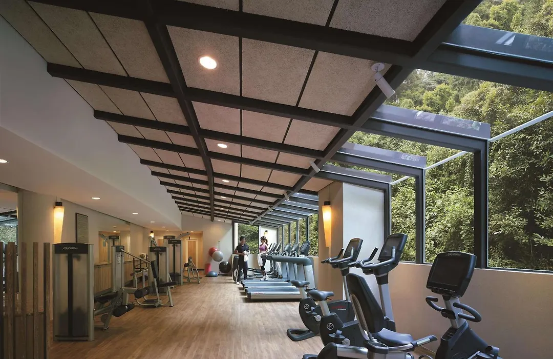 Leisure facilities at Shangri-La Rasa Sentosa, Singapore include a children's pool with three water slides and Nestopia, an open-air play area with slides. Chi, The Spa offers holistic treatments for adults, and a fully equipped gym provides workout options with views of nature. Guests can partake in complimentary water sports like kayaking and paddleboarding.
