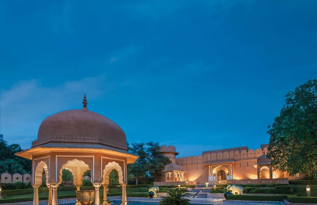 The Oberoi Rajvilas offers wellness facilities including The Oberoi Spa, a temperature-controlled swimming pool with elephant water fountains, and a fitness center. Guests can participate in daily yoga sessions and exclusive experiences such as astrology consultations and cultural workshops.