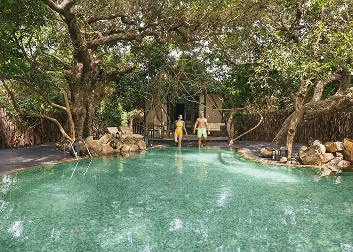 Uga Jungle Beach - Trincomalee is a 5-star resort featuring 49 luxury cabins set within a 4 hectare reserve between a private beach and lush jungle. The hotel offers a luxurious spa, a fitness center, and diverse dining experiences, with signature options including beach barbecues and tree-top dinners.